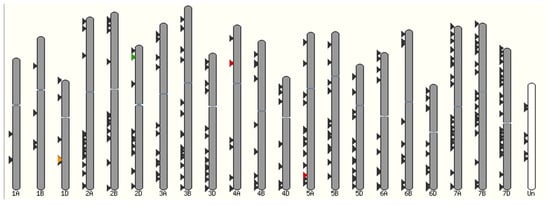 Chromosomal distribution of all identified NAC transcription factors in the wheat genome. The four NAC transcription factors associated with salt tolerance are highlighted across the seven chromosomes of the A, B, and D subgenomes in Chinese Spring wheat. “Un” indicates unassigned scaffolds of the wheat chromosomes. The centromere of each chromosome is indicated by a small constriction. Orange, NAC_1D (TraesCS1D02G263800) on chromosome 1D; green NAC_2D (TraesCS2D02G100900) on chromosome 2D; NAC_4A (TraesCS4A02G130600) on chromosome 4A and NAC_5A (TraesCS5A02G468300) on chromosome 5A are both colored red.