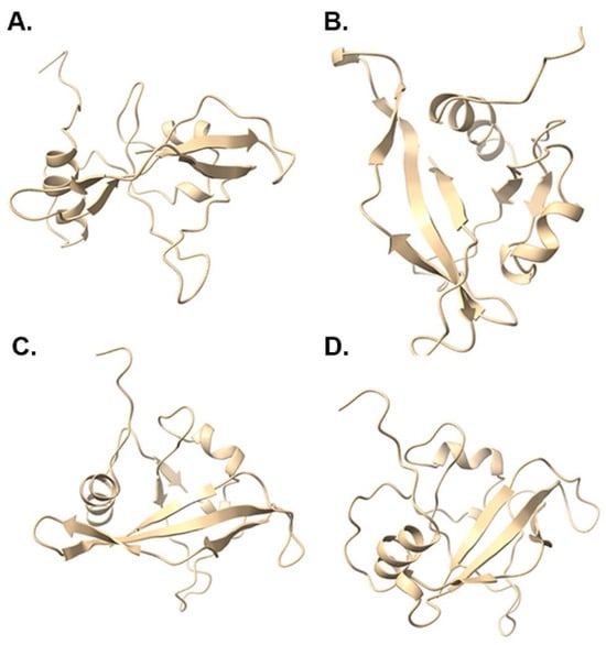 Predicted three-dimensional structures of the four wheat NAC transcription factors generated using AlphaFold. (A) NAC_1D; (B) NAC_2D; (C) NAC_4A; (D) NAC_5A.