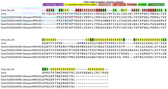 Multiple sequence alignment of wheat NAC sequences with the Arabidopsis NAC structure (PDB ID: 3SWM). Amino acids identified as DNA-binding residues in 3SWM are colored according to their different categories: magenta, proline/glycine (conformationally special); blue, polar; red, with positive charge; pink, aliphatic/hydrophobic; green, with negative charge; orange, aromatic. Color coded secondary structures elements are labeled as follows: B, beta-bridge residue; E, extended strand (beta sheet); G, 3/10 helix; H, hydrogen bond; I, Pi-helix; S, bend; T, H-bonded turn. To be noted, no beta-bridge residues were identified in the NAC sequences.