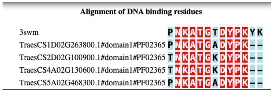 The NAC protein sequences were searched against the Protein Data Bank (PDB) using the BLAST tool (https://blast.ncbi.nlm.nih.gov/Blast.cgi, accessed on 2 February 2024). The experimentally determined structure of a NAC domain bound to DNA (PDB ID: 3SWM) was identified and aligned with the NAC transcription factor domain sequences obtained in this study. DNA-contacting amino acids were identified using MSALigMap [].