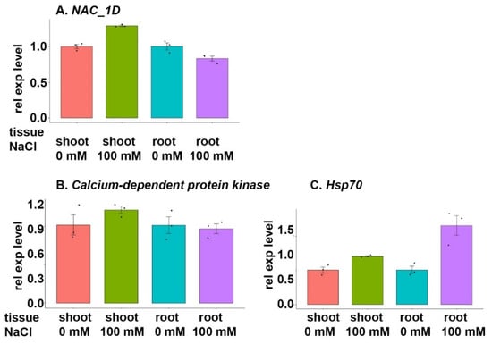 The RT-qPCR analysis of the gene encoding the NAC_1D (TraesCS5A02G237200) TF revealed upregulation in shoot tissues under NaCl stress compared to control samples (Figure 7A). Its predicted target genes, Calcium-dependent protein kinase (TraesCS2A02G456100) and Hsp70 (TraesCS1D02G284000), also showed upregulation in shoot tissues (Figure 7B,C). In contrast, in root tissues, downregulation of NAC_1D was associated with a similar downregulation of Calcium-dependent protein kinase, whereas Hsp70 exhibited strong upregulation under salt stress (Figure 7).