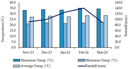 Monthly rainfall and temperature (maximum, average, and minimum) during the experimental period in Vicentina, Mato Grosso do Sul State, Brazil. Source: Guia Clima—Embrapa.
