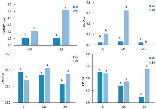 A significant interaction was observed between cropping systems and row spacings for crude protein (CP) content (Table 2; Figure 2). The key finding was that the wider 90 cm spacing resulted in a significantly higher CP content only in the Zuri grass intercropping (ZS). In this specific system “ZS” at 90 cm, the CP content was equivalent to that of the monoculture (7.27% of DM). Conversely, in the same “ZS” intercropping but at the 45 cm spacing, the lowest CP value of the entire study was recorded (6.22% of DM). In the other treatments (S and MS), row spacing did not drastically alter the silage protein content.