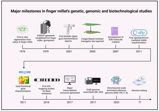 Advances in biotechnology now offer unprecedented opportunities to unlock the full genetic potential of finger millet. Emerging resources such as annotated genome [], transcriptomics [], proteomics [] and metabolomics provide molecular insight into stress tolerance and nutrient regulation in millets, including finger millet. Similarly, genome editing, genomic selection, and speed breeding can accelerate varietal improvement beyond the limits of traditional breeding [,]. Only a few studies have reported on genome sequencing, genomic selection, and genetic transformation in finger millet. No report is available on genome editing in finger millet till date. This review synthesizes recent progress in genomic resources, functional gene discovery, tissue culture, and genetic transformation in finger millet. It also draws inroads for CRISPR/Cas-based genome editing in finger millet. It further integrates strategies for nutrient biofortification, abiotic stress resilience, and high-throughput phenotyping for crop improvement. By combining molecular innovations, finger millet can be redefined as a climate-resilient, nutrient-dense cereal suited to future food systems.