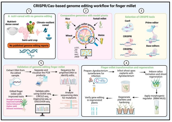 Proposed CRISPR/Cas-based genome editing workflow for finger millet. This schematic outlines the stepwise strategy for establishing genome editing in finger millet, a nutrient-dense, climate-resilient cereal with no published genome editing reports. (1) Context and significance: Finger millet is a semi-arid crop rich in micronutrients (Fe, Zn, and Ca) and resilient to stress but lacks reported genome editing studies. (2) Target discovery through comparative genomics: Candidate genes (e.g., LGS1, ZIP, YSL, NAC, DREB) are identified by comparison with model cereals including foxtail millet, rice, maize, and wheat. (3) Selection of CRISPR tools: suitable editors such as Cas9, CRISPR interference (CRISPRi), CRISPR activation (CRISPRa), base editors, and prime editors are chosen depending on the desired modification. (4) Transformation and regeneration: Shoot apex explants are infected with Agrobacterium tumefaciens, followed by callus induction, shoot regeneration, and optional application of morphogenic regulators (BBM, WUS) to enhance transformation efficiency. Edited plantlets are regenerated and verified. (5) Validation and trait assessment: Edits are confirmed using PCR and sequencing-based assays (GUIDE-seq, CIRCLE-seq, Digenome-seq, or DISCOVER-seq). Edited lines are evaluated for improved traits such as drought tolerance, nutrient enrichment, salinity tolerance, higher yield, and disease resistance.