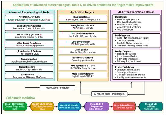 Application of advanced biotechnology tools and AI-driven prediction in finger millet. The left panel compiles advanced biotechnological tools such as CRISPR/Cas nucleases, base and prime editors, CRISPRi/a regulators, RNAi/VIGS/VOX, Agrobacterium and biolistic transformation, robust regeneration pipelines, and speed breeding—which both generate actionable datasets and enable precise genome modifications. The right panel outlines an AI-driven design stack that integrates multi-omics and phenotyping like genome and pangenome resources, QTL/GWAS haplotypes, RNA-seq and ATAC-seq, metabolome/proteome profiles, and field phenotypes. Machine-learning modules such as guide on/off-target predictors, gradient-boosting and random-forest trait models, graph neural networks for regulatory and co-expression networks, and sequence transformers prioritize trait-linked genes, propose promoter-motif edits, assemble multiplex gRNA sets, and draft HDR/prime-editing donors, followed by in silico validation of off-targets, pleiotropy, metabolic constraints, and environmental stability. The central panel lists breeding targets like blast resistance; drought and heat tolerance; Fe and Zn biofortification and low-phytate grain; improved grain quality; earliness; lodging resistance; AMF symbiosis and phosphorus-use; and reproductive control for hybrid seed. The bottom schematic summarizes the schematic workflow.