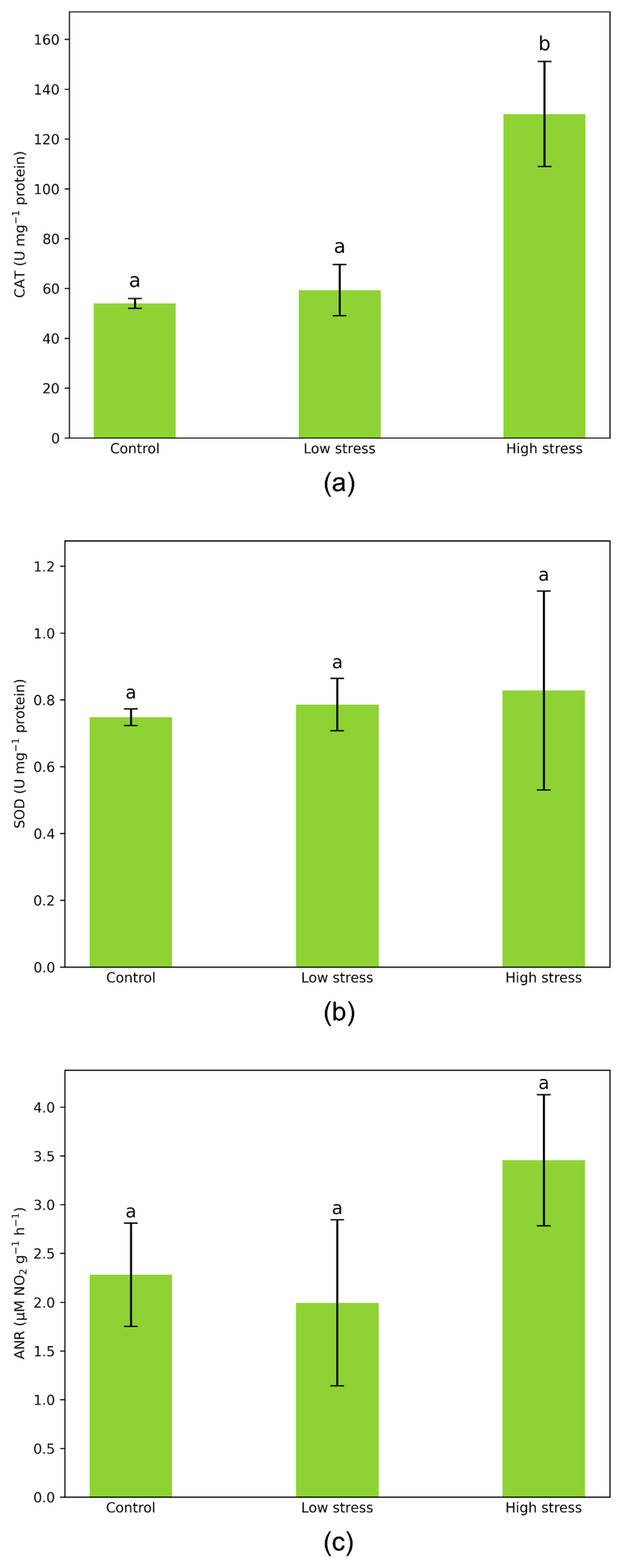 3.4. One-Way ANOVA of V. faba Biochemical Stress Parameters