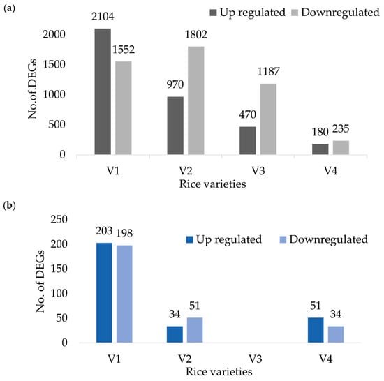 Differentially Expressed Genes for four rice varieties (a) root samples and (b) leaf samples.