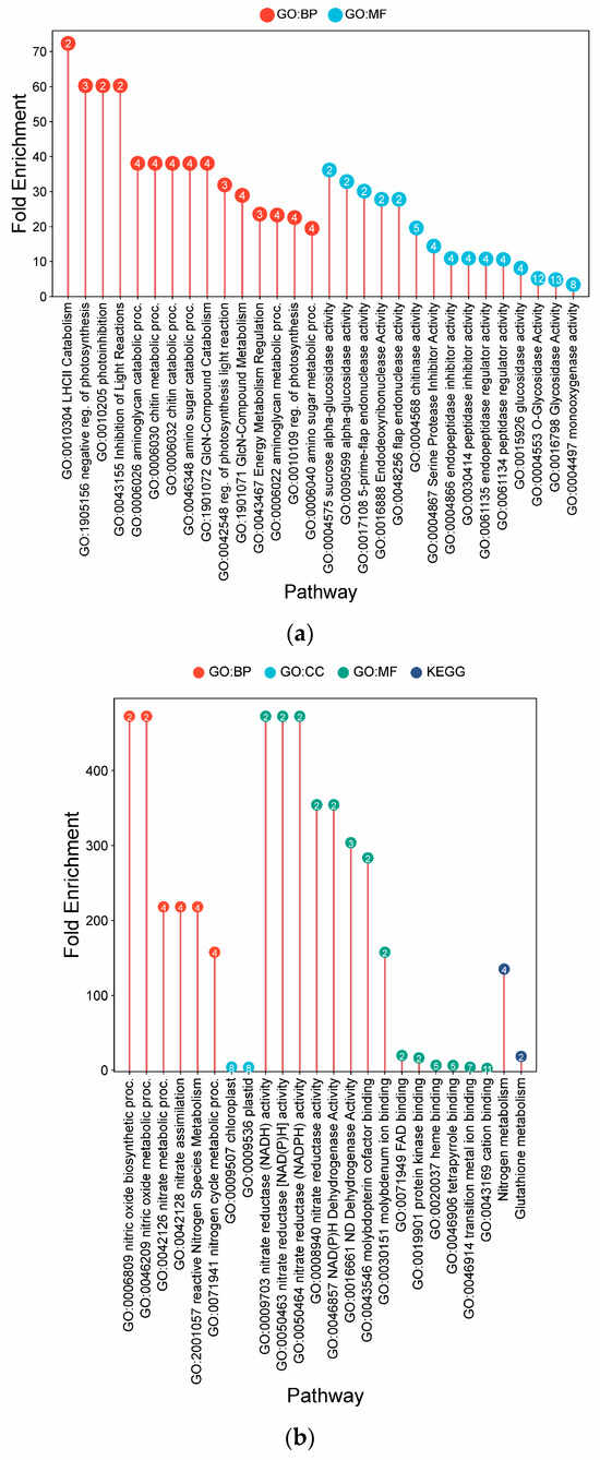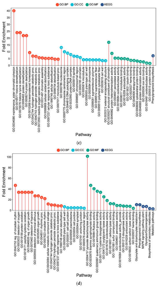 In contrast, in Hitachi hatamochi CF-responsive DEGs were primarily associated with signaling and defense coordination (Figure 6b). Key enrichments included MAPK cascade (18.61-fold) and plant hormone signal transduction (16.20-fold), with specific DEGs encoding pathogenesis-related protein 1b (OsPR1b, LOC_Os01g03820) and an ethylene-insensitive protein (OsEIL4, LOC_Os08g05087). Broader categories related to defense (8.24-fold) and stress response (4.21-fold) were also enriched. A single-gene enrichment was detected for lysine biosynthesis (115.82-fold), though its functional relevance remains unclear.