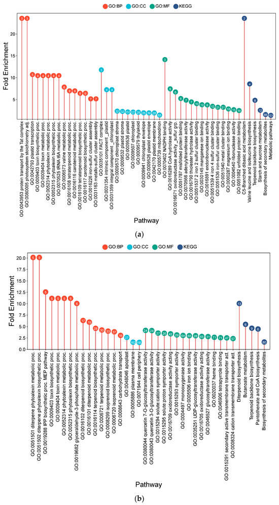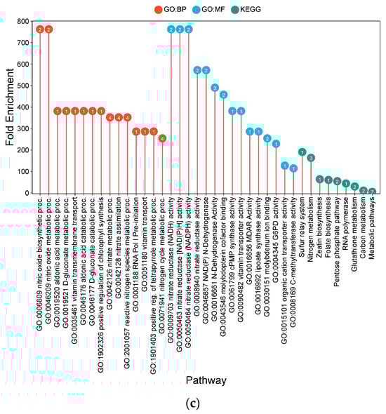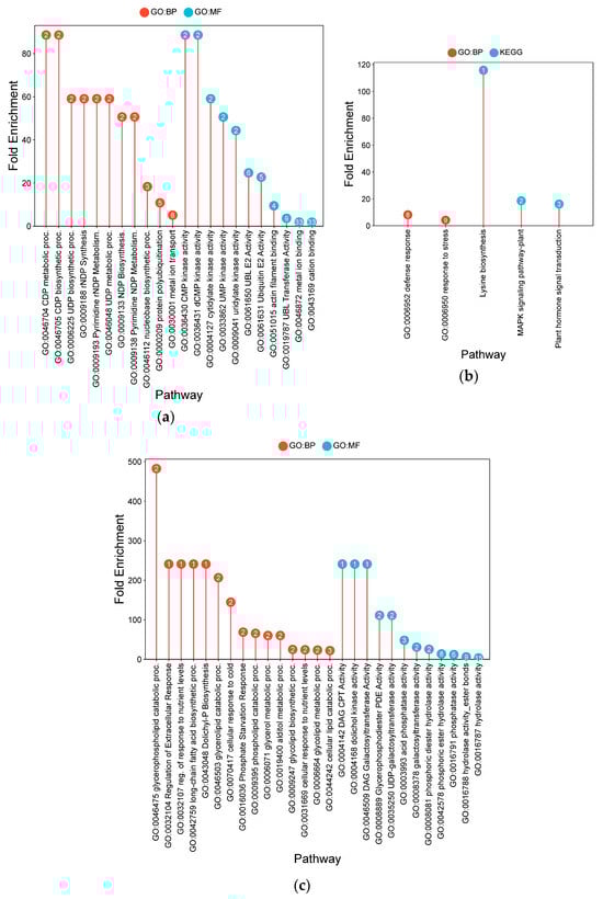 Lollipop charts showing the top 15 Gene Ontology (GO) terms for each GO category (BP—biological process; CC—cellular components; MF—molecular function) and KEGG for leaf samples under CF conditions, plotted by fold enrichment. Numbers in circles refer to the number of genes in each pathway that overlap with the gene list. (a) IR64; (b) Hitachi hatamochi; (c) Akita komachi.