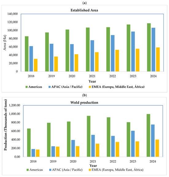 In line with the expansion of these genetic groups, the global area dedicated to blueberry cultivation has increased markedly over recent years (Figure 1a). By 2024, worldwide blueberry area reached approximately 282,192 hectares, with the Americas accounting for the largest share of established plantations. Between 2018 and 2024, global cultivated areas increased by 58.4%, reflecting sustained investment and market-driven expansion. The most pronounced growth occurred in the Asia–Pacific (APAC) region, which added nearly 44,687 hectares during this period, driven largely by the rapid adoption of southern highbush cultivars, intensive production systems, and protected cultivation technologies. Although area expansion continued across all regions, the annual rate of new plantation establishment slowed slightly between 2022 and 2024 in both the Americas and EMEA, suggesting a gradual transition from extensive expansion toward consolidation, intensification, and productivity-oriented strategies in more mature production systems.