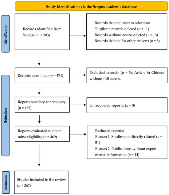 Inclusion and exclusion criteria were defined to ensure the scientific, methodological, and thematic relevance of the analyzed documents. A total of 469 records were evaluated to determine eligibility, considering as potentially relevant those focused on the integrated management of blueberry (Vaccinium spp.) cultivation that addressed aspects such as propagation, physiology, mineral nutrition, irrigation, plant health management, sustainability, harvest, postharvest, or technological innovation. Studies that did not align with the review’s objective, lacked verifiable experimental or methodological information, or did not provide full-text access were excluded. The main reasons for exclusion from the total records evaluated were as follows: Reason 1, studies not directly related to the integrated management of Vaccinium spp. (n = 51); Reason 2, publications without sufficient experimental information (n = 14); and Reason 3, documents that did not address the main topics of the review (n = 37). The selection process, in accordance with PRISMA 2020 guidelines, ensured transparency and reproducibility of the analysis and is summarized in the flow diagram (Figure 1), which details the stages of identification, screening, and exclusion of studies