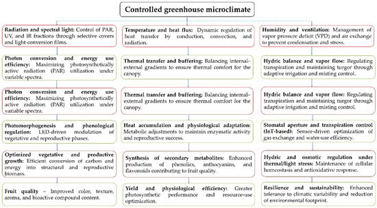 Within this framework, light down-conversion has proven effective in modifying the spectral quality under cover conditions. In controlled tunnels over one growing season, films enriched in red wavelengths significantly increased biomass in the ‘Duke’ cultivar and suggested a positive effect on yield, in addition to favoring the accumulation of carbohydrate reserves for the following cycle. However, its adoption requires multi-year validation with adequate replication to confirm physiological benefits and cost–benefit relationships [97]. In this context, the eco-physiological engineering framework of blueberry cultivation under controlled environments (Figure 4) integrates the dynamic interactions between microclimate and crop physiology, emphasizing how energy, water, and radiation fluxes regulate key processes such as photomorphogenesis, transpiration, and secondary metabolite synthesis, which directly influence fruit quality and production efficiency. This systemic perspective underscores the need for coordinated management of spectral radiation, ventilation, and humidity, together with thermal and water control strategies, to achieve a functional balance between growth, yield, and physiological sustainability.