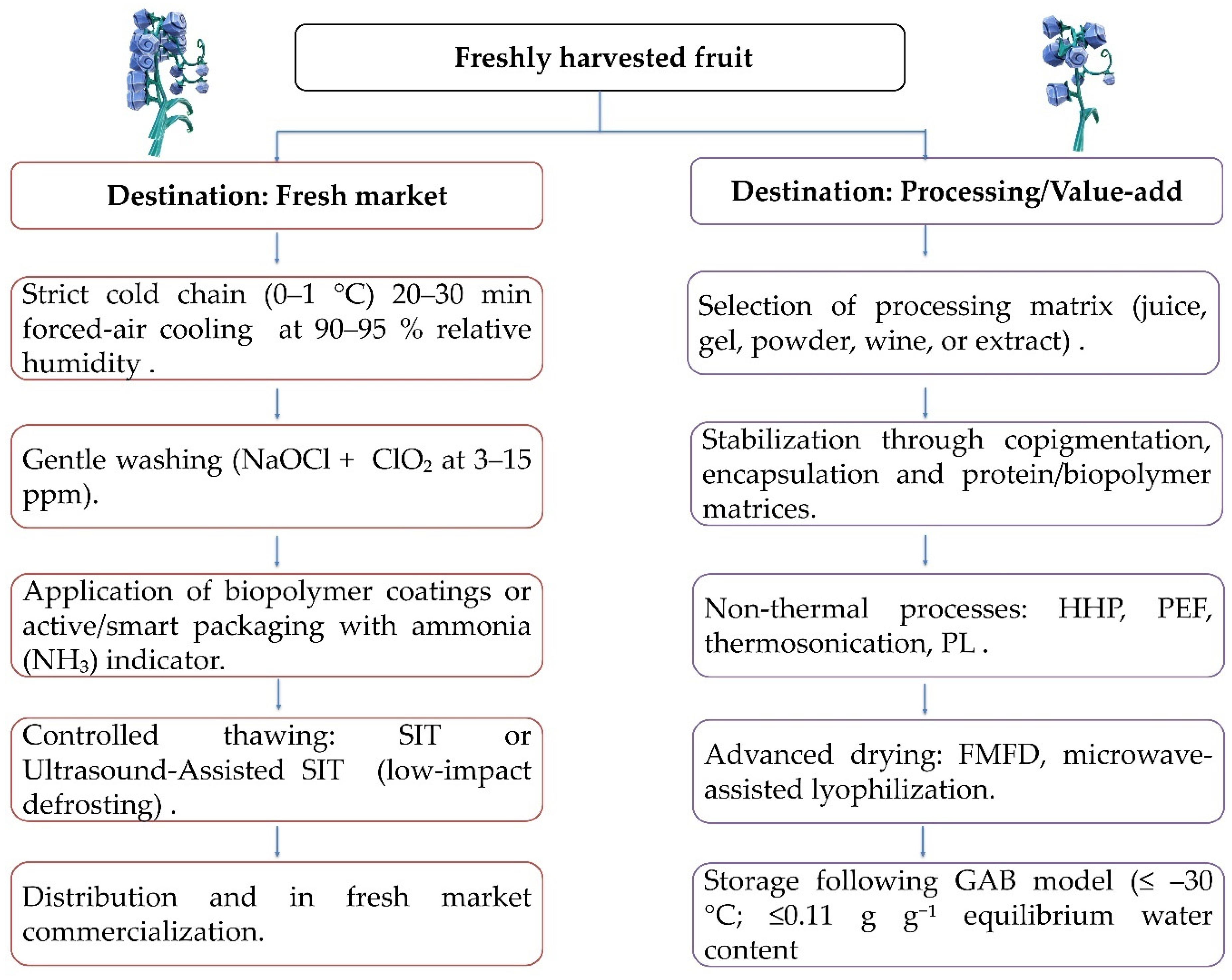 | Cold Chains/Thawing | −80/−40/−20 °C; SIT/UASIT | Whole fruit | Reduced drip loss; anthocyanins and °Brix maintained (UASIT > SIT) | Pilot | Electric; critical for logistics | [129] |