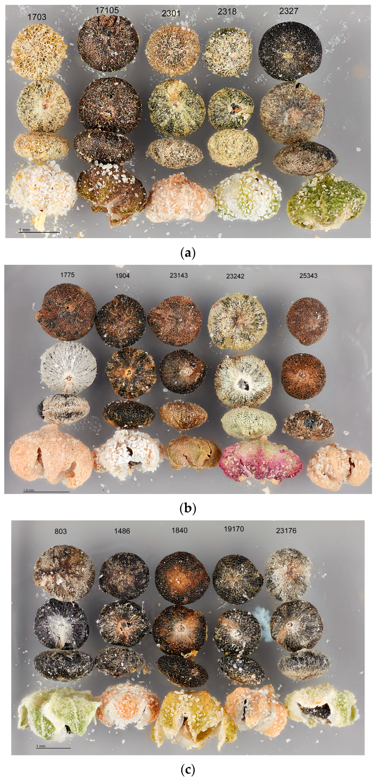 - Habibi, F.; Mosyakin, S.L.; Shynder, O.I.; Krak, K.; Čortan, D.; Filippi, G.A.; Mandák, B. Chenopodium ucrainicum (Amaranthaceae), a new ‘BB’ genome diploid species: Karyological, cytological, and molecular evidence. Bot. J. Linn. Soc. 2023, 203, 401–410. [Google Scholar] [CrossRef]
