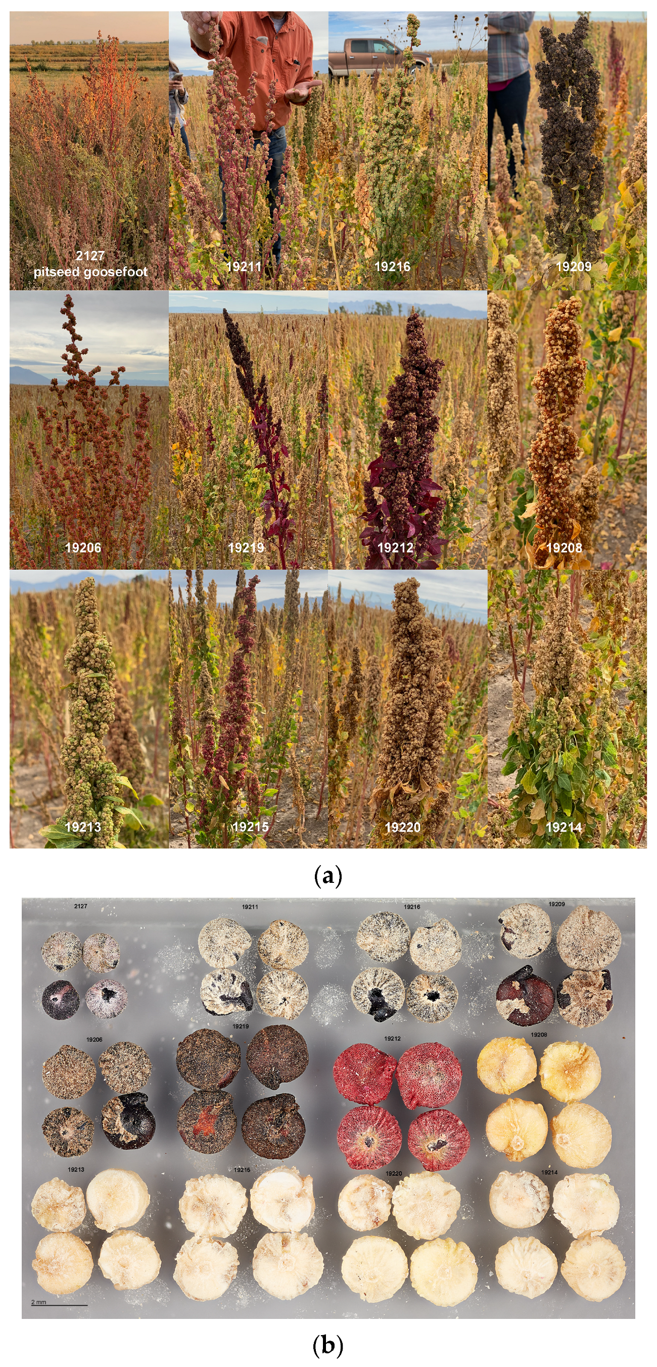 - Maughan, P.J.; Jarvis, D.E.; de la Cruz-Torres, E.; Jaggi, K.E.; Warner, H.C.; Marcheschi, A.K.; Bertero, H.D.; Gomez-Pando, L.; Fuentes, F.; Mayta-Anco, M.E.; et al. North American pitseed goosefoot (Chenopodium berlandieri) is a genetic resource to improve Andean quinoa (C. quinoa). Sci. Rep. 2024, 14, 12345. [Google Scholar] [CrossRef]