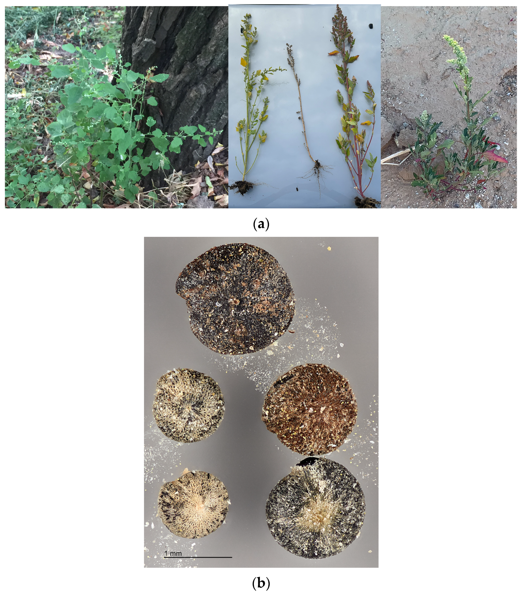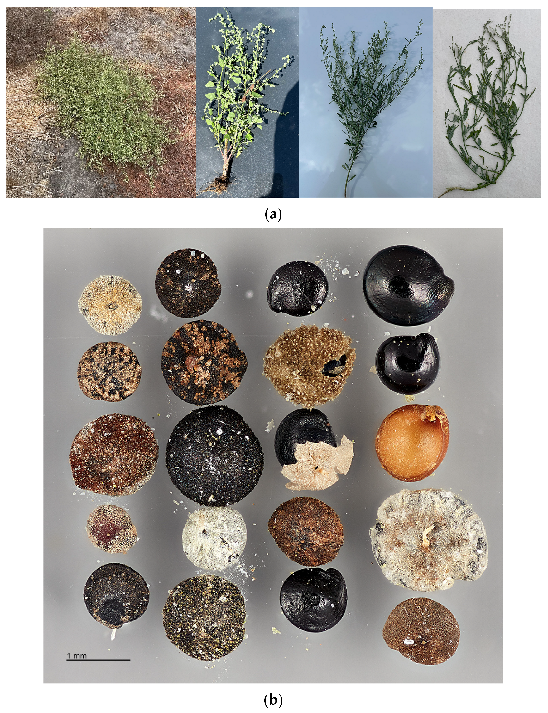 - Clemants, S.E.; Mosyakin, S.L. 7. Chenopodium. In Flora of North America; Oxford University Press: Oxford, UK, 2004; Volume 4, pp. 261, 265, 267, 268. Available online: http://www.efloras.org (accessed on 15 November 2025).