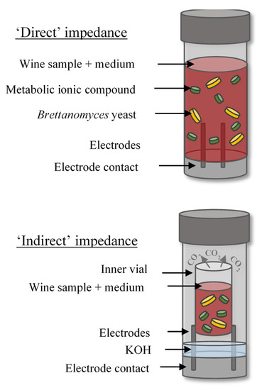 The BacTrac™ 4300 instrument (Sy-Lab, Neupurkersdorf, Austria), which consists of one incubator (64 measuring cells) and computer software, was used to perform impedance measurements. Figure 1 includes a detailed diagram of ‘direct’ and ‘indirect’ impedance methods. Selective media for yeast and mould BiMedia 510A and 501B nutrient broths were used for ‘direct’ and ‘indirect’ enumeration impedance methods, respectively. The ‘direct’ method measures the impedance of the nutrient broth-sample mixture in direct contact with the electrodes in the measurement cell. For the ‘indirect’ method, the nutrient broth-sample mixture is contained in an isolated smaller inner cell located inside the measurement cell. The bottom of the measurement cell contains a dilute solution of potassium hydroxide (KOH), which undergoes a change in impedance through the uptake of CO2 from the microorganisms in the inner cell during metabolism. Therefore, there is no direct contact between the sample mixture and the electrodes. The following detection parameters were used for the ‘direct’ method: delay time 1 h, evaluation type E and threshold E-value 12%. The parameters for the ‘indirect’ method were: delay time 1 h, evaluation type M2 and threshold M-value −25%. For the ‘direct’ method, 1 mL of homogenized wine sample was inoculated into 9 mL of BiMedia 510A in prefilled cells. For the ‘indirect’ method, 1 mL of 0.2% KOH solution was added to the outer cell and 1 mL of homogenized wine sample was added to 5 mL BiMedia 501B in the inner vial. The cells were sealed using plastic screw caps before being inserted into the BacTrac incubator. Next, the samples were incubated at 30 °C for up to 90 h, during which cell growth occurred and thus changing the total impedance, which was recorded in 10 min intervals. The method was adapted from protocol H51 and V7.50.1 (supplied by Sy-Lab) for the ‘direct’ and ‘indirect’ methods, respectively. Previous research demonstrated that BiMedia 510 A and B supports B. bruxellensis growth [13].