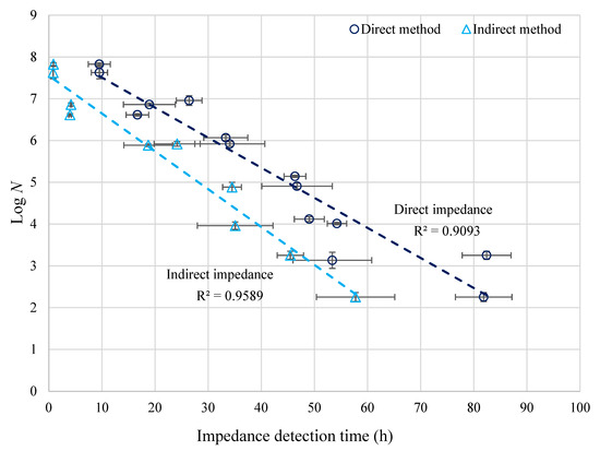 Linear relationship between log numbers of B. bruxellensis in wine (N, cfu/mL) and ‘direct’ and ‘indirect’ impedance detection times (h); Error bars represent the standard deviations of the plate count and impedance results.