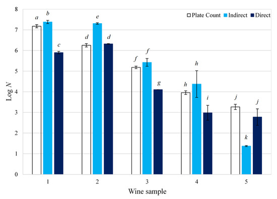 Five red wine samples of a different vintage, with concentrations ranging from 103 and 107 cfu/mL, were analyzed. The enumeration of Brettanomyces in these samples was conducted using plate counting as a reference. Equations (2) and (3) were then used to calculate the ‘direct’ and ‘indirect’ impedance yeast concentration, respectively. A comparison between the three B. bruxellensis enumeration methods is presented in Figure 3. The ‘direct’ method was slightly more accurate with an average percentage error of 15.9%, compared to that of the ‘indirect’ method, which was 18.6% (Equation (1)). For samples with a Brettanomyces concentration above 104 cfu/mL, the ‘indirect’ method generally proved to be more accurate, with an average percentage error of 8.2% compared to that of the ‘direct’ method (13.2%). Contrastingly, the ‘direct’ method was more accurate at concentrations below 104 cfu/mL, with an average percentage error of 19.8% compared to 34.2% for the ‘indirect’ method. As expected, samples with a low yeast concentration are more difficult to quantify and thus presented results with higher variability. These results are in agreement with the results described earlier.