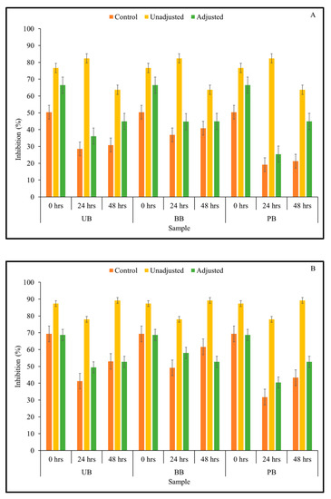 As seen in the current study, LAB-mediated fermentation was found to improve the α-glucosidase inhibitory activity in other plant-based substrates such as pear juice and camu-camu [38,66]. However, it is important to note that improvements in α-glucosidase inhibition by Kefir-fermented barley slurries was not found to be pH-independent. From Figure 5, it is apparent that the pH-adjusted samples had lower α-glucosidase enzyme inhibitory activity than the corresponding pH-unadjusted samples, which was found consistently across barley sample type and fermentation duration. This trend is comparable to the findings of earlier studies, where the inhibitory activity of L. acidophilus-fermented pear juice was significantly higher at fermented acidic pH than the corresponding pH-adjusted samples at every fermentation time point [38]. Therefore, this anti-hyperglycemic relevant function of fermented plant substrates may be influenced more by the change in acidity of the medium induced by organic acid production than the release of phenolic compounds in fermented matrix.