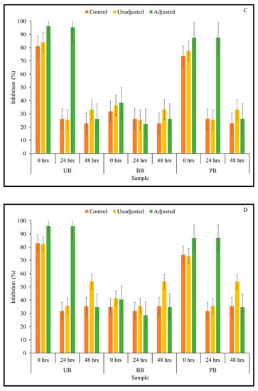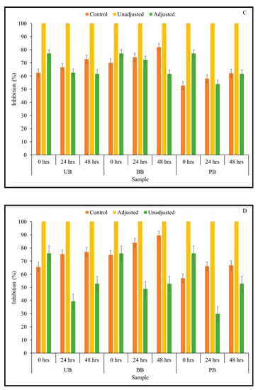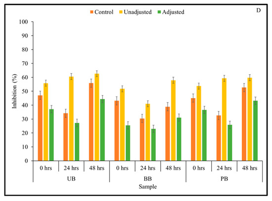 α-Amylase inhibitory activity of Kefir-fermented slurries derived from sprouted (0, 24, 48 h) unpigmented barley (UB), black barley (BB) and purple barley (PB) after 0 h (A), 24 h (B), 48 h (C) and 72 h (D) of fermentation.
