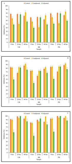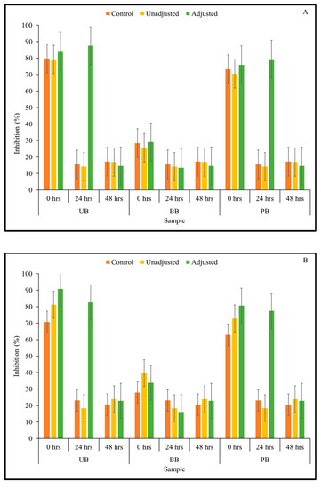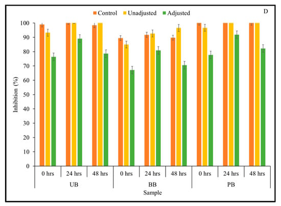 As fermentation progressed from 0–72 h, α-amylase enzyme inhibitory activity of the fermented barley samples was also found to increase concurrently (Figure 4). Overall, the highest α-amylase enzyme inhibition was observed after 72 h of fermentation. At this fermentation time point, the inhibitory activity of specific sample combinations (UB-24, UB-48, BB-24, BB-48) reached complete saturation in terms of α-amylase enzyme inhibition (i.e., 100% inhibition), while remaining barley samples had 70–90% α-amylase enzyme inhibitory activity.