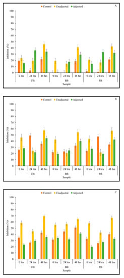 The fermented samples exhibited a clear dose-dependent relationship, however, only values indicating data from the undiluted samples are presented here (Figure 4). All three main effects on α-amylase enzyme inhibitory were found to be statistically significant at p < 0.05, across all fermentation time points (Table 1).