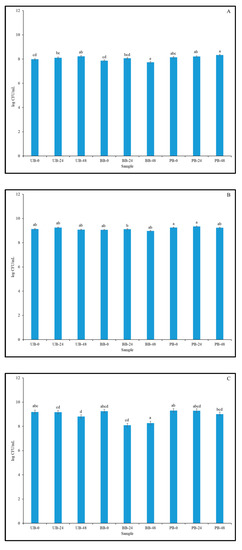 To achieve higher probiotic function in fermented plant food substrates, it is important to have higher concentration of active and viable cells of beneficial LAB strains. In the current study, the total viable cell counts of the inoculated mixed LAB strains in the pH-unadjusted slurry of barley flour slurries at each fermentation time point were found to increase from the initial level at 0 h. As the duration of the fermentation increased, the cell count was found to either increase in some sample combinations, while in other samples, it remained relatively constant (Figure 6).