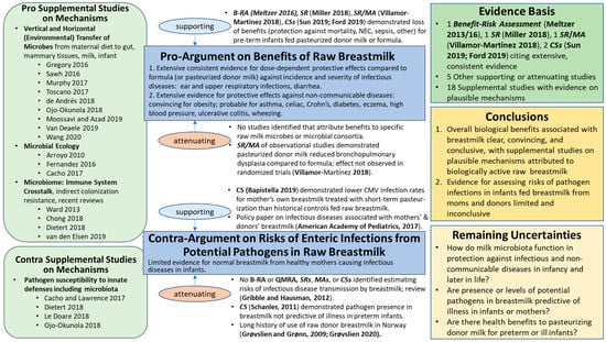 Extensive, consistent evidence of benefits was identified from recent systematic reviews (one including a meta-analysis), a subsequent cohort study, and a benefit–risk analysis for the pro-argument on the benefits of raw breastmilk. In contrast, limited evidence was identified for the contra-argument on the risks of enteric infections from potential pathogens in raw breastmilk.