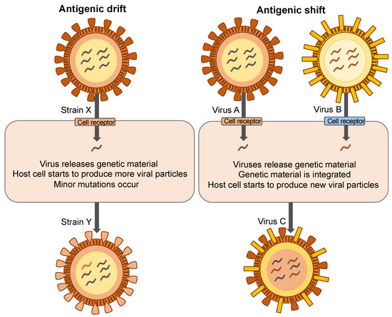 Viral mutation is an important driver of the spread of disease. Mutant strains may not be recognized by the immune system and treatment options may be limited. Antigenic drift and antigenic shift can diminish the efficacy of vaccines (Figure 1). When a shift occurs, the mutant virus is more likely to cause a pandemic as the population has no immunity towards it [13]. For example, as severe acute respiratory syndrome coronavirus-2 (SARS-CoV-2) spreads around the world it is slowly mutating [14]. Most mutations do not significantly affect virility, however, gain-of-function mutations offer an evolutionary advantage and spread quickly through populations. For example, both SARS-CoV-1 and SARS-CoV-2 use the angiotensin-converting enzyme 2 (ACE2) receptor for entry into host cells [15]. Yet the SARS-CoV-2 virus is more efficient for cell entry [16,17]. The delta variant of SARS-CoV-2 spreads up to 3× faster than the original strain [18]. This variant replicates rapidly in human hosts, is more effective to enter cells, and may suppress the host immune system [19]. Researchers have identified mutations in the spike protein D614G, which increases the density of this protein on the surface, facilitating greater entry into cells [20,21]. Currently, the available vaccines for SARS-CoV-2 are effective against the delta variant [22]. However, it is evolutionarily unavoidable that a vaccine-resistant strain will emerge and leave us unprotected [23]. Thus, non-vaccine strategies must be included to prevent the spread of disease. To replicate and spread, viruses need a living host, and so the most effective way to reduce the spread of mutant strains is to eradicate them before they can infect a host.