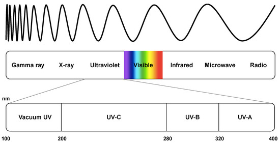 Ultraviolet germicidal irradiation uses UV wavelengths of light in the germicidal range (320–200 nm). The electromagnetic spectrum is presented in Figure 3. Radiation below 320 nm is acintic, causing photochemical reactions when exposed [64]. UVA (320–400 nm) lies outside this range and is not considered germicidal [64]. As the name suggests, vacuum UV only propagates in a vacuum due to its rapid absorption by oxygen in the air. Due to the predominant germicidal action of UVC light and its dominant use in commercial systems, other forms of UV are not discussed in detail unless required.