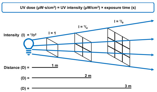 The relationship between UV intensity, distance from the source, and time required to achieve germicidal dose for effective microbial inactivation.