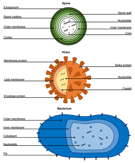 Biological compositions of a spore, virion, and bacterium.