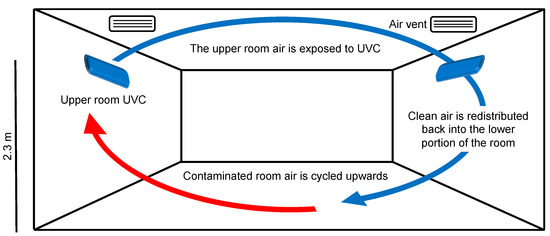 Upper room UV systems are engineered to create a germicidal zone of UVC light, confined to the uppermost portion of the room (Figure 7). The basic principle is to maximize the UVC exposure of upper-room air while minimizing exposure to room occupants below. This requires sufficient room air circulation and the exchange of ‘‘clean’’ and ‘‘contaminated’’ air between the two zones. As air enters the germicidal zone, it is disinfected. These upper room UV systems can run continuously, which is useful for high-risk environments such as operating theatres or waiting rooms. As UVC is particularly hazardous to the human cornea, the maximum eye-level irradiance dose is set to 0.2 µW/cm2 in the lower portion of the room [108]. Many studies have shown the benefits of upper room UV systems, particularly reducing transmission of tuberculosis and measles [109,110,111,112].
