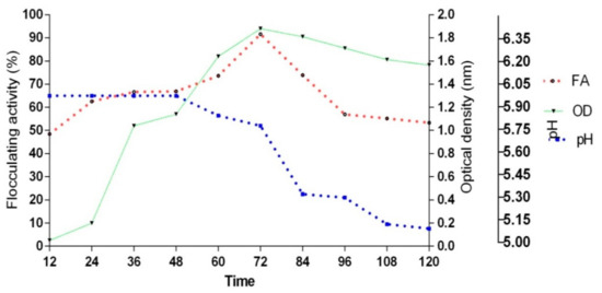 The effect of time on bioflocculant production by P. mirabilis AB 932526.1 in correlation with flocculating activity (FA), optical density (cell growth; OD) and pH was evaluated at the cultivation period of 120 h (Figure 4). The pH of the production medium remained constant in the first two days of the experiments. It then decreased from pH 5.76 to pH 5.16 during 60 to 120 h. The decrease in pH was perceived to be the result of organic acid being produced by P. mirabilis AB 932526.1 during the metabolism process [59,62]. The highest flocculating activity of 92% was observed at 72 h of fermentation period. The slight increase in flocculating activity was observed during lag phase (24 to 60 h). A rapid decrease in flocculating activity was observed after 72 h of fermentation, which was an indication of the shortage of nutrients for microbial growth [40]. The increase in cell growth was noticed from the first three days of fermentation. A slight decrease in cell growth was observed at 84–120 h. As the cells increased, so did the flocculating activity. Hence, the parallel increase in cell growth and flocculating activity indicates that the bioflocculant was produced through biosynthesis [24]. The results were in close conformity with the study by Xia et al. [25], who reported the maximum flocculating activity of 93% by the bioflocculant produced by Proteus mirabilis TJ-1 under optimised conditions. In this study, the optimisation of the culture conditions and medium composition significantly increased the flocculating activity by 22%. Thus, the obtained and preferable optimum conditions were employed during the production of the bioflocculant by P. mirabilis AB 932526.1, which was later extracted from the broth culture and partially purified.
