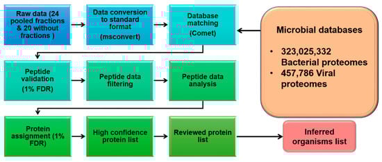 The available bacterial and viral proteome sequences were downloaded from UniProt [31] (as of 19 October 2020) in FASTA format. The compiled bacterial dataset had 3 × 109 protein sequences compared to the viral dataset of 7 × 105 protein sequences, originating from 7688 bacteria and 9484 viruses. This dataset was used to develop the microbial analysis platform for healthy human plasma (HHP).