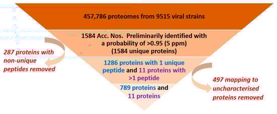 HHP samples were also investigated regarding the existence of viral proteins. The viral dataset contained over 457,786 proteomes originating from about 9515 viral strains. Data were processed using the same protocol as that used for bacteria (Figure 4). After passing the first processing stage, 1286 viral accession numbers (Acc. No.) were identified using a single unique peptide. Another 11 proteins were identified, in accordance with the HPP guidelines [33], with 2 or more non-nested peptides of at least 9 amino acids, all of which were ‘reviewed’ proteins in the uniport database (Figure 4).