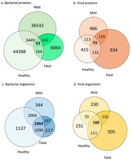 Protein profile and microbial distribution in the plasma of mild and fatal SARS-CoV-2 patients, compared to the plasma of healthy controls. Comparison of (a) identified bacterial proteins, (b) identified viral proteins, (c) bacterial organisms, and (d) viral organisms.