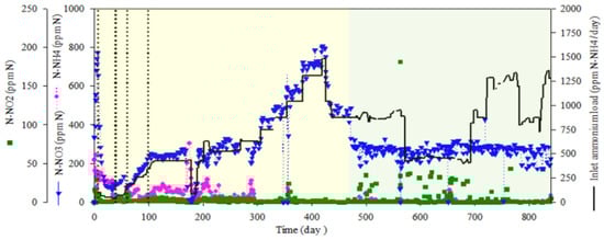 The complete bioreactor operation, including nitrogen species profiles and ammonium load fed into the bioreactor, is presented in Figure 3. After the inoculation of the packed-bed bioreactor, a batch mode phase was maintained for five days. Pulses of concentrated ammonium (N-NH4+; 100 g × L−1) up to a final target concentration of 100 mg N-NH4+·L−1 in the bioreactor were added when depleted. After five days in batch phase, a continuous culture mode was established in the packed-bed reactor at a hydraulic residence time (HRT) of 80 h for 30 days. HRT was stepwise decreased from 80 to 60, 40 and, finally, to 14 h on day 60. From day 60 to day 435, ammonium was progressively increased until a maximum of 1478 mg N-NH4+·L−1·day−1 by increasing the ammonium concentration in the inlet medium. From day 435 to 475, the ammonium load was progressively decreased to 860 mg N-NH4+·L−1·day−1 by decreasing the ammonium concentration in the inlet medium in order to prepare the next experimental step. From day 475 until the end of the test, the system was fed with different ammonium loads by means of reducing HRT from 14 h to 6 h, reaching phases where the ammonium load was at 1285 mg N-NH4·L−1·day−1 (Table 1). Complete nitrification was obtained from day 300, when an inlet ammonium load of 750 mg N-NH4+·L−1·day−1 was fed into the bioreactor. From day 300 to the end of the test, 99% ammonium removal was obtained with no nitrite accumulation, indicating a full nitrification result. The major achievement of the test was maintaining continuous full nitrification over 1.5 years, where the nitrification rate was recovered very fast after occasional NH4+/NO2− accumulation events due to operational changes. Additionally, the bioreactor was exposed to different ammonium loads, by changing ammonium concentration in the inlet media or HRT, and the system was able to achieve 99% ammonium removal with a rapid adaptation to the new conditions whatever the load was tested, indicating robust biofilm formation. The temperature was maintained at 30 °C. The pH was initially set to 7.5 and increased to 8.1 when the packed-bed was fully colonized. Recirculation liquid flow from the top to the bottom section of the bioreactor was maintained at 108 L·day−1 to improve the homogeneity of the liquid phase.