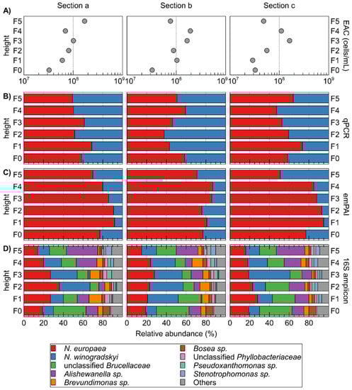 Characterization of different sections (five vertical sections, each divided into three horizontal sections a, b, and c) of the packed-bed based on ATP-measured equivalent active cells (EAC) counts (A); qPCR- (B); and emPAI-based (C) determination of the relative abundance of N. europaea versus N. winogradskyi; and relative abundance of OTUs in 16S rRNA gene amplicons (D). Relative abundance N. europaea versus N. winogradskyi based on 16S rRNA gene amplicons is also plotted (cross) on qPCR panels (B).