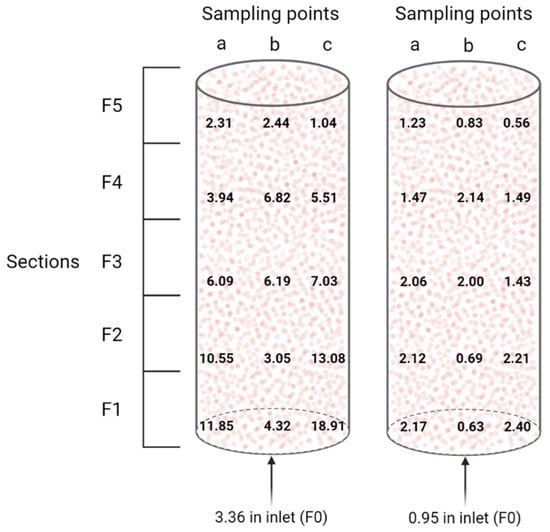 Collection of the samples was performed using sterile material, but the bioreactor was opened to the air, when stopping it after 840 days of continuous operation. The packed-bed was divided vertically in five different sections (F1-F2-F3-F4-F5), each divided in three radial sampling points (a, b, c) (Figure 2). The height of each vertical section was set at 0.112 m. From each sampling point, a total amount of 0.1 L beads were collected. In addition, one 0.1 L sample (F0) below the packed-bed was taken. After collection, each 0.1 L sample was split into two. One part was flash-frozen in liquid N2 and stored at −80 °C, and the second was submerged in phosphate-buffered saline (PBS) and stored at 4 °C.