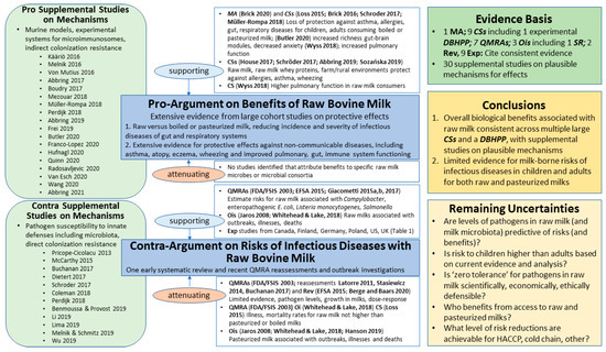 The process for creating a cow’s milk evidence-based map for decision making paralleled our recent publication (in this Special Issue): an example comparing pasteurized donor milk and unpasteurized (raw) human breastmilk [64]. As such, the extensive literature on the microbiota of cow’s milk and assessments of benefits and risks was compiled over multiple years of this project, including results of searches, as well as manuscripts and reports submitted by our project partners. Combinations of key words (e.g., raw or unpasteurized, milk, microbiota, benefit, risk, bovine OR cow) were used in searches of PubMed, Google Scholar, and the Cochrane database of systematic reviews in combination with discipline-specific key words by multiple authors. Additional studies were identified by forward searching studies citing key references by discipline. This study focuses on recent reviews and human experimental and observational studies.