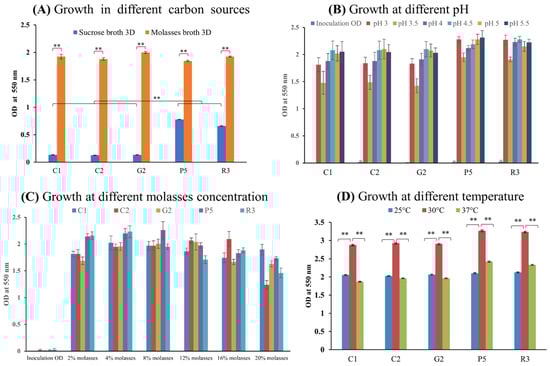 For determining the ability to grow at 25 °C, 30 °C, and 37 °C, and which temperature is optimum, the yeast strains were cultured in a liquid medium of pH 4.5 containing 4% (w/v) molasses (previously determined as optimum), 1% peptone, 0.5% yeast extract and 0.5% sodium chloride. The sterile media were inoculated with the same number of actively grown yeast cells and incubated at 25 °C, 30 °C, and 37 °C for 4 days. The optimum temperature for growth and maximum biomass production was determined by using a spectrophotometer at 550 nm.