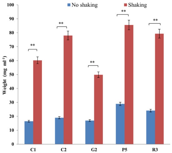 To determine the effect of shaking on biomass production by the yeast isolates, the same number of actively grown yeast cells were inoculated in a liquid medium of pH 4.5 containing 4% (w/v) molasses (previously determined as optimum), 1% peptone, 0.5% yeast extract and 0.5% sodium chloride. Then these were incubated at 140 rpm and 30 °C temperature (previously determined as optimum) in a shaking incubator. After 4 days, the culture broth was centrifuged at 5000 rpm and 4 °C for 10 min and the supernatant was decanted. The pellets were weighted to determine biomass production in shake culture. By comparing this with previous data, the effect of shaking was determined.