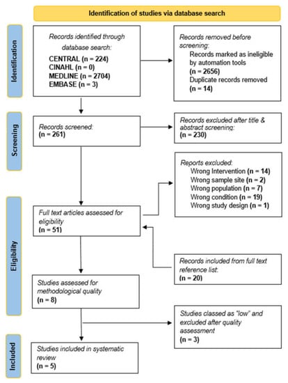 The electronic search retrieved a total of 2931 records from the following databases: CENTRAL (224), CINAHL (0), MEDLINE (2704) and EMBASE (3). After excluding duplicates and records marked as ineligible by automation tools, there were 261 records, 230 of which did not meet the inclusion criteria; 31 were selected for full reading. A manual search of the references from the 31 articles was performed, retrieving an additional 20 new titles. Titles and abstracts not related to the topic were initially excluded. Having selected articles based on the inclusion and exclusion criteria, a total of 51 full text articles have been assessed for eligibility according to all selection criteria; 43 studies were excluded at this stage. After careful reading and quality assessment, 8 articles were categorized according to methodological quality as follows: high (2), moderate (3), low (3). Low-quality articles were excluded from this systematic review. Consequently, 5 studies were included (Figure 1). The general characteristics of the included studies are presented in Table 4. Furthermore, risk of bias for the included articles appeared to be low.