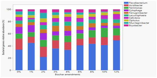 In agricultural systems, Bacteroidetes are abundant and noted for their ability to metabolize organic matter exploitation [56]. In the present study, the high abundance of Bacteroidetes, which was second only to Proteobacteria, regardless of the percentage of biochar added to growth media, agreed with previous findings [56]. According to [57,58], Bacteroidetes promote plant growth and plants’ resistance to environmental stress. Other authors reported that Bacteroidetes are enriched in environments with high C availability [59], and hence their high abundance in biochar amendment media in the present study was not a coincidence. Verrucomicrobia was third in abundance in all the samples analyzed, ranked behind Proteobacteria and Bacteroidetes Based on their lower growth rates and adaptations for growing on relatively recalcitrant forms of C, a major component of biochar, and a major constituent of the growth media in the present study, Verrucomicrobia is classified as an “oligotroph” [60].