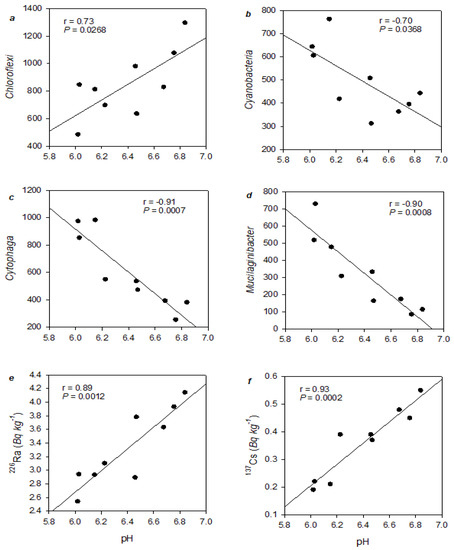 Figure 3 shows that pH was related both positively and negatively to the percentage of various bacteria phyla in treatments. Specifically, media pH positively correlated with Chloroflexi (r = 0.73, p = 0.0268) and negatively correlated with Cyanobacteria (r = −0.70, p = 0.0368) (Figure 3a,b, respectively). At the bacterial genera level, there were significant negative correlations between pH and the genera Cytophaga (r = −0.91, p = 0.0007) and Mucilaginibacter (r = −0.90, p = 0.0008) (Figure 3c,d, respectively). Similarly, Figure 3e,f, respectively, show that pH was positively correlated with radionuclides 226Ra (r = 0.89, p = 0.0012) and 137Cs (r = 0.93, p = 0.0002).