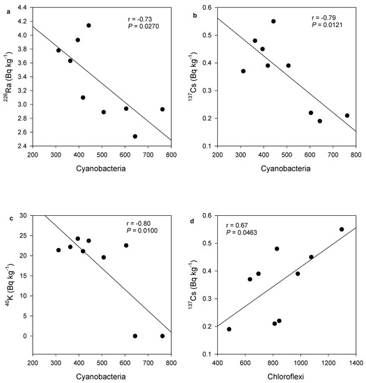 Bacterial phylum Cyanobacteria was negatively correlated with 226Ra (r = −0.73, p = 0.0270) (Figure 4a), 137Cs (r = −0.79, p = 0.0121) (Figure 4b) and 40K (r = −0.80, p = 0.0100) (Figure 4c). In contrast, Chloroflexi was positively correlated with 137Cs (r = 0.67, p = 0.0468) (Figure 4d). At the bacteria genera level, both Cytophaga and Mucilaginibacter negatively correlated with radionuclide activity concentrations. Cytophaga was positively correlated with 226Ra (r = −0.84, p = 0.0047), 40K (r = −0.82, p = 0.0069) and 137Cs (r = −0.93, p = 0.0002) (Figure 5a–c). Similarly, Mucilaginibacter was positively correlated only with 137Cs (r = 0.87, p = 0.0021) and 226Ra (r = −0.83, p = 0.0054) (Figure 5d,e). The negative correlations of the above bacteria phyla and genera with the radionuclides suggested that greater counts of these bacteria phyla and genera are associated with lower radionuclide content in the samples. However, there were no significant correlations for sample physicochemical parameters, and or for bacterial proportions with activity concentrations of 235U and 232Th.