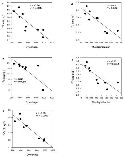 Correlations between number of genotypes detected from the genus Cytophaga with activity concentrations of (a) 226Ra, (b) 40K, and (c) 137Cs, and from the genus Mucilaginibacter with (d) 137Cs and (e) 226Ra.